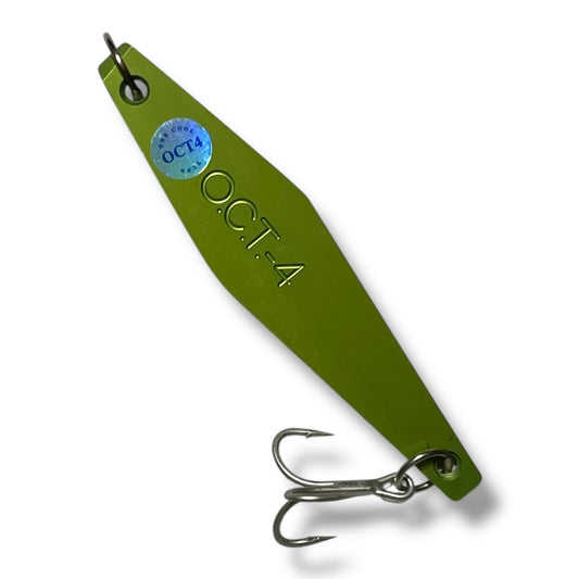 O.C.T.-4 – The scaled down version of the O.C.T.-10, just under 6″ long and weighs in at 2.8 oz. Cut from 6061 T6 billet Aluminum. Comes with a VMC 3/0 4X Treble Hook. If you are a fan of the Tady 4/0 lite, you will love this version of the O.C.T. Jigs. All the same colors as the O.C.T.-10, but with better action for a smaller Jig.
